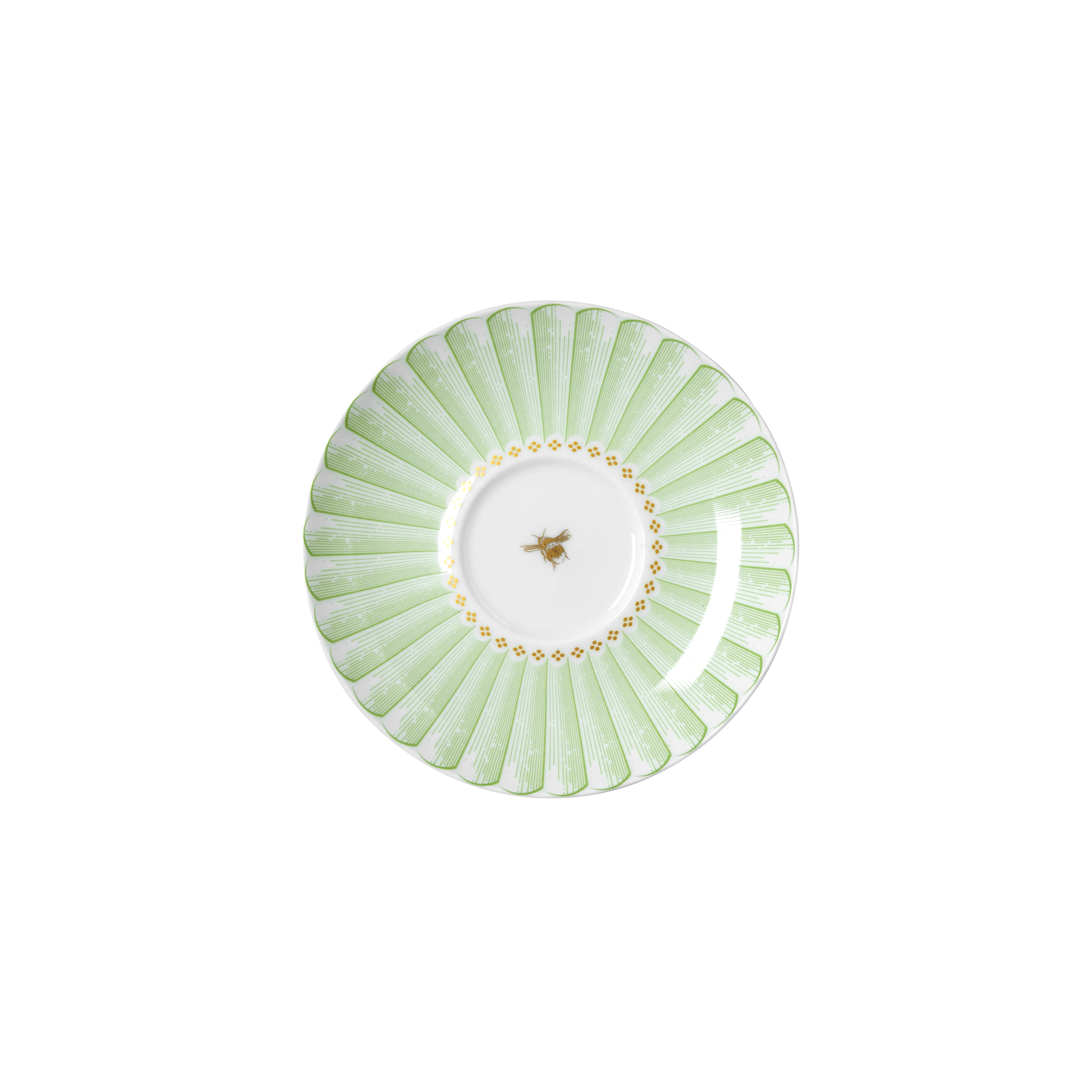 Making up part of the highly sought-after tea for one collection, the tea for one saucer is encapsulated by a radial petal-like design with a stunning 'gold bee' motif at the centre of the saucer. The complete tea for one set is hand-decorated with a delicate design of tea plants, a subtle scalloped border, and an intricate gold bee, making for a joyous and homely tabletop.